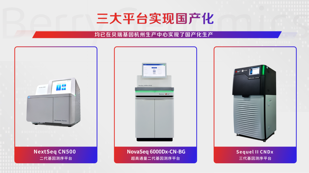 貝瑞基因目前打造了以NextSeq CN500、NovaSeq 6000Dx-CN-BG 以及 Sequel II CNDx 為代表的三大測序平臺。2019年,NextSeq CN500適用范圍變更獲得國家藥品監(jiān)督管理局批準,成為了適合大規(guī)模臨床基因檢測的NGS通用型平臺;Sequel II CNDx 已通過技術要求檢驗,目前處于醫(yī)療器械注冊申報中的臨床試驗階段;NovaSeq 6000Dx-CN-BG目前處于注冊檢驗階段。自2021年起,三大平臺均已在貝瑞基因杭州生產(chǎn)基地落地生產(chǎn),實現(xiàn)了真正意義上的國產(chǎn)化。